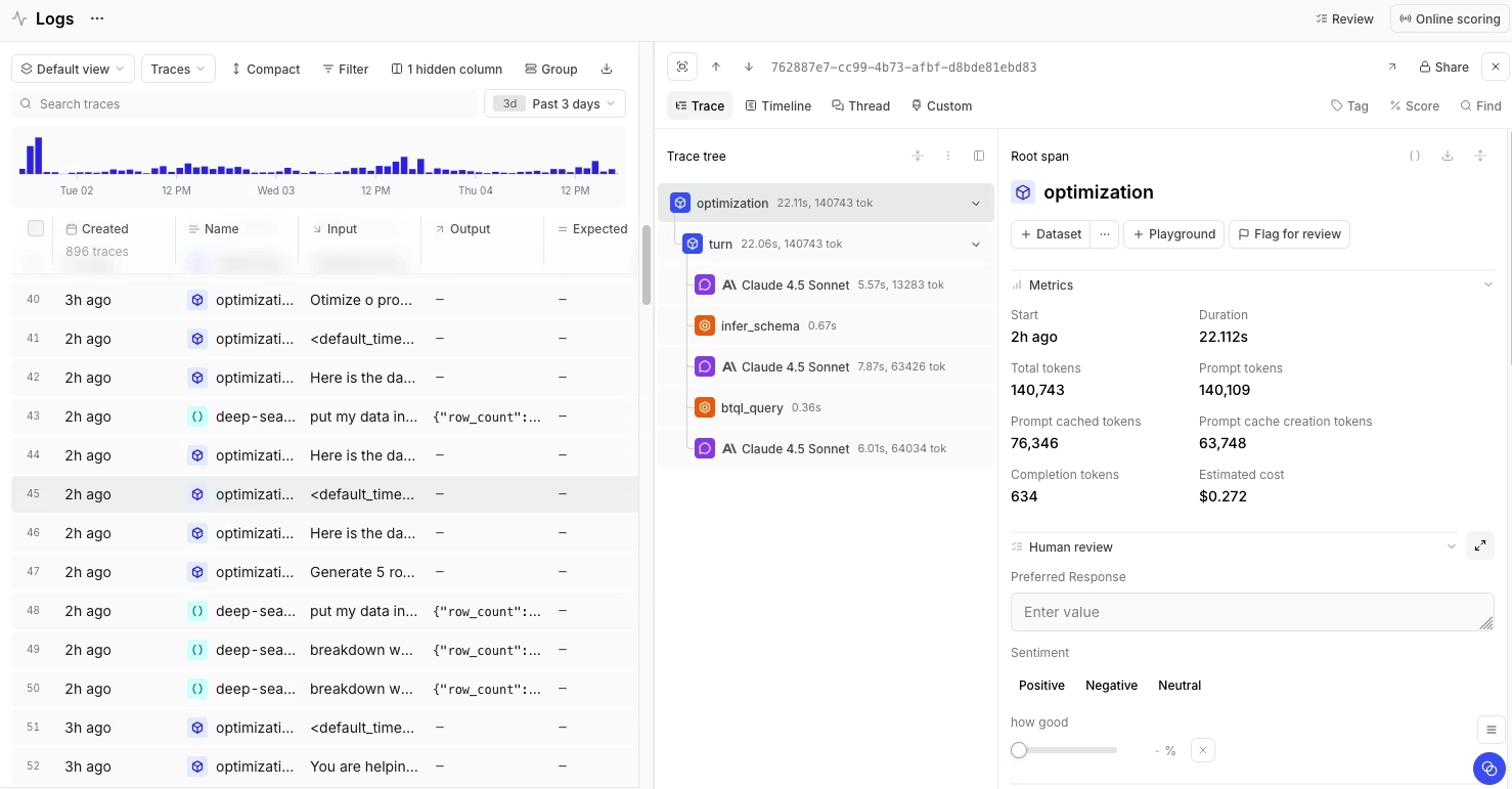 When looking to improve prompts or hill-climb on evals against scorers, there is no AI agent that iterates on your prompts and evals to improve your agent. And at scale, teams running complex agents hit storage and query bottlenecks because general-purpose databases were never designed for LLM trace payloads.