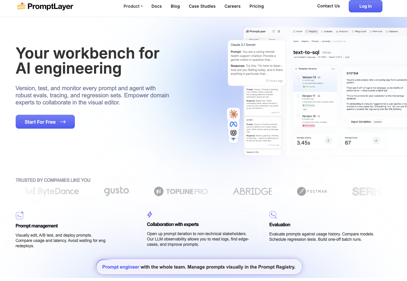 PromptLayer takes a middleware approach: wrap your existing LLM API calls with PromptLayer's proxy, and every request is logged with full prompt version history. The visual dashboard lets non-engineers manage prompt templates, A/B test variants, and view basic performance metrics without modifying application code.