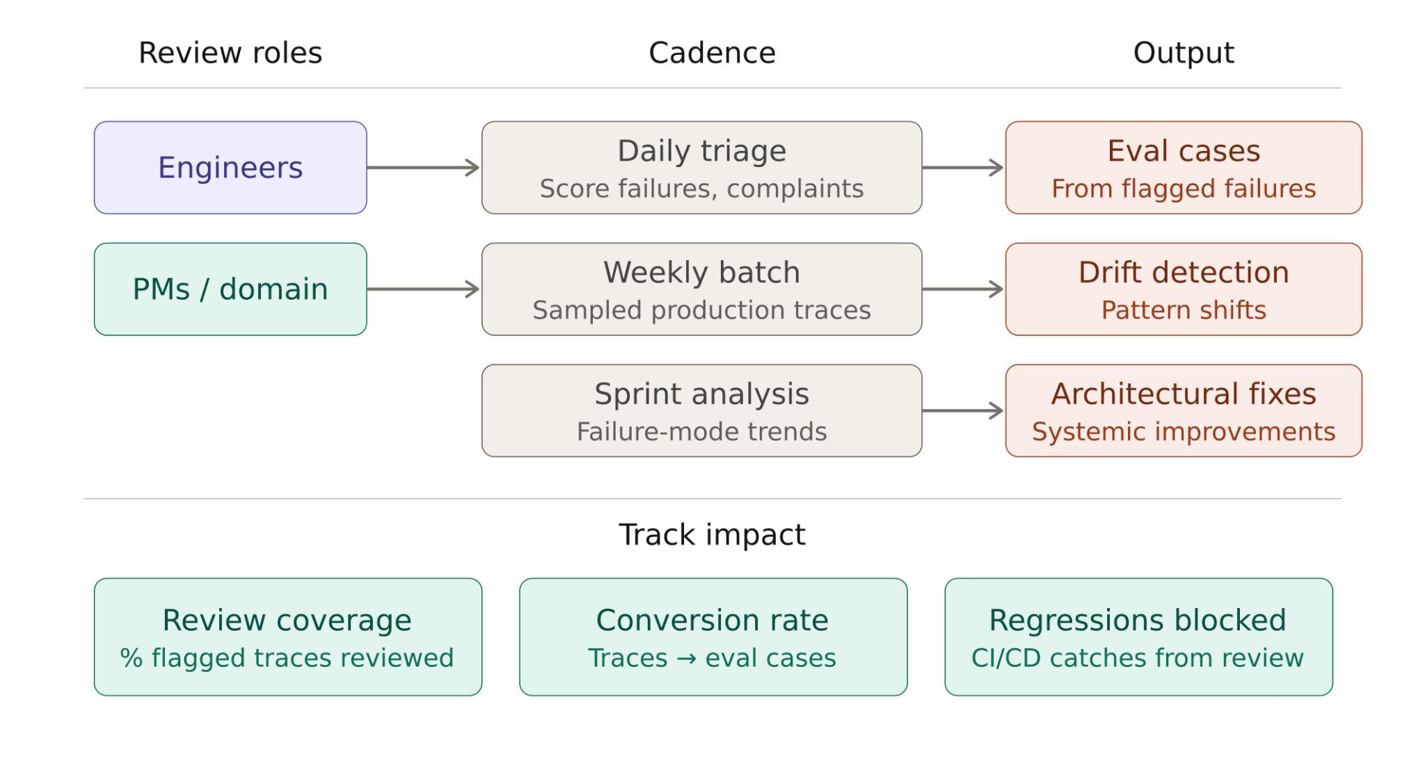 The review process also needs separate layers for urgent issues, recurring patterns, and longer-term system changes. Daily triage handles score failures and user complaints that need immediate attention. Weekly batch review covers sampled production traces and helps teams spot drift. Sprint-level analysis groups failure tags into broader trends that point to architectural fixes.